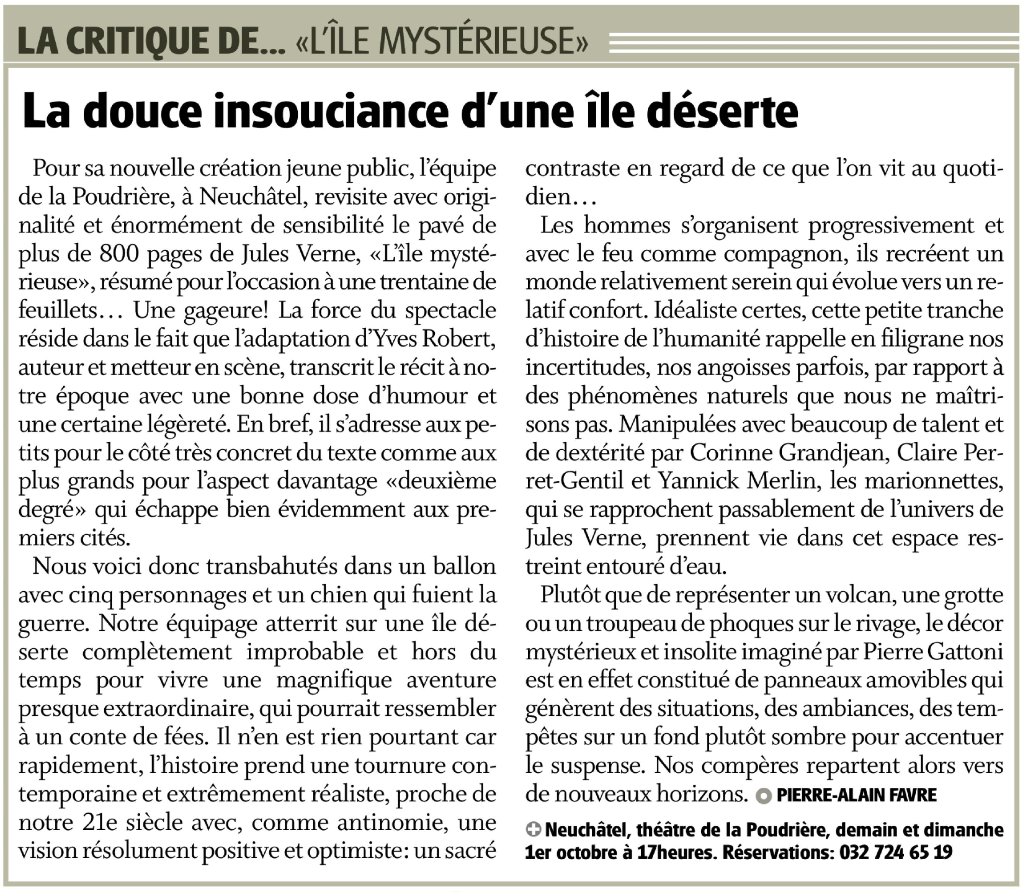 LES AVENTURES DE PETCHI ET VOILA-VOILA spectacle pour enfant, mes Benjamin Knöbil, Théâtre du Pommier, Neuchâtel, rôle: Petchi / LE PASSE EST ENCORE A VENIR, Cie Poésie en arrosoir, mes Dominique Bourquin, Jardins botaniques, Cernier