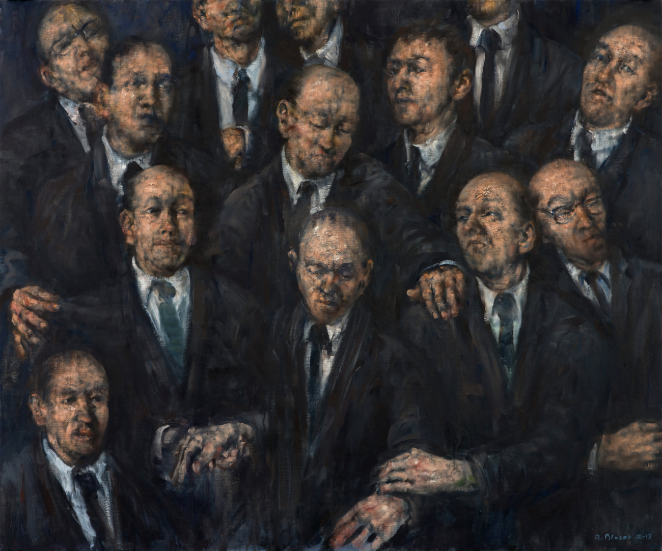 Ce visage est devant un fond rouge comme exposé à la curiosité du spectateur – comme le reflet de la propre interrogation de Rolf Blaser sur la marche du monde – peut-être est-il aussi chargé de la troublante ressemblance entre le portrait et le peintre.